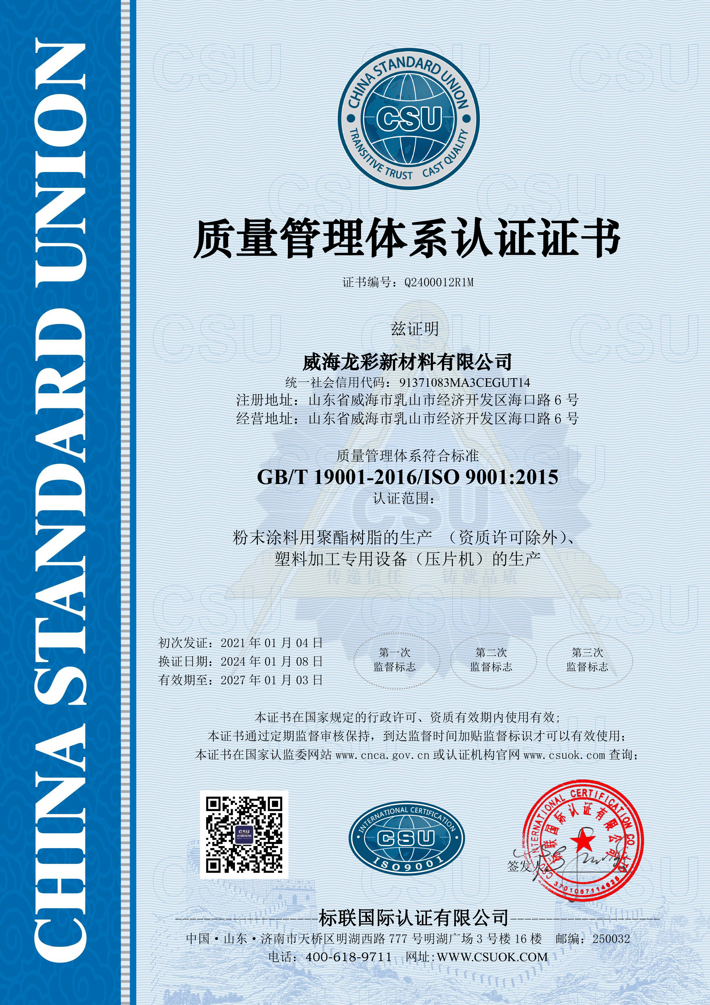 龍彩新材料有限公司成立于2007年,是致力于粉末涂料用樹脂及特殊樹脂研發和制造的高新技術企業。公司以可持續發展為目標,技術創新為驅動力,為粉末涂料市場提供優質的產品與服務。龍彩現已通過質量質量管理體系認證ISO9001和環境管理體系認證ISO14001,并因其在可持續發展的努力和目標在2023年首次榮獲Ecovadis金牌認證,名列全球前5%。